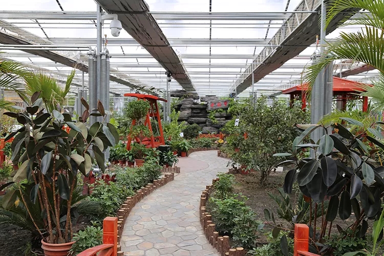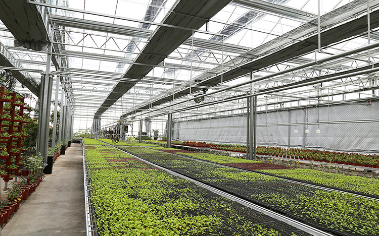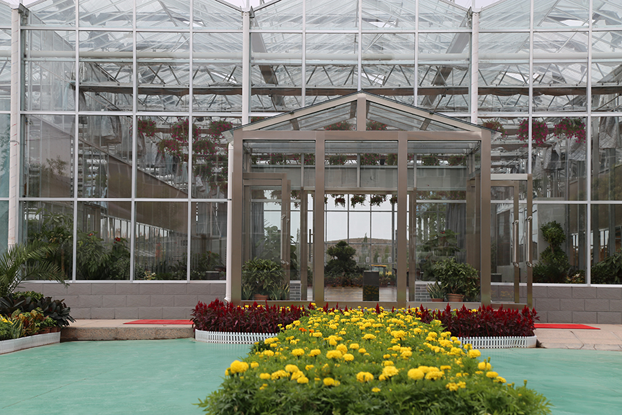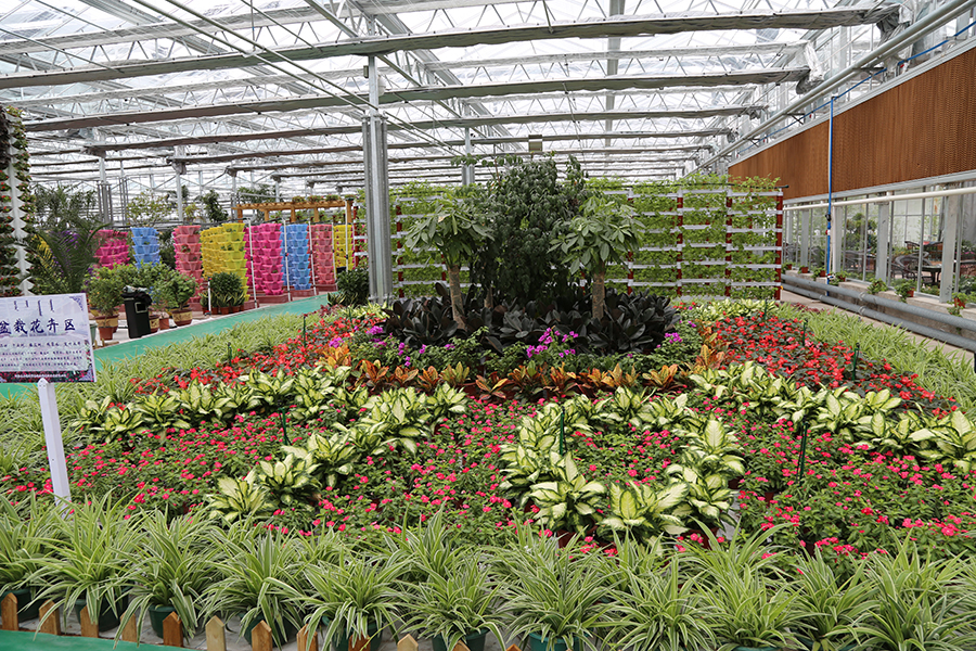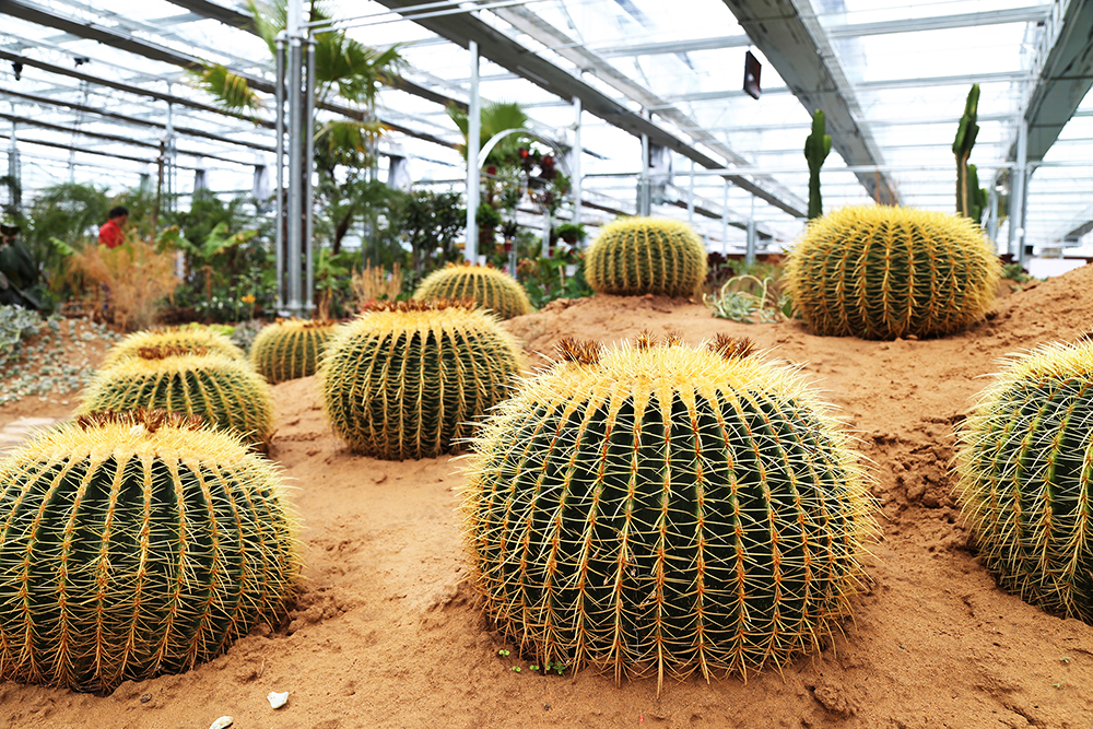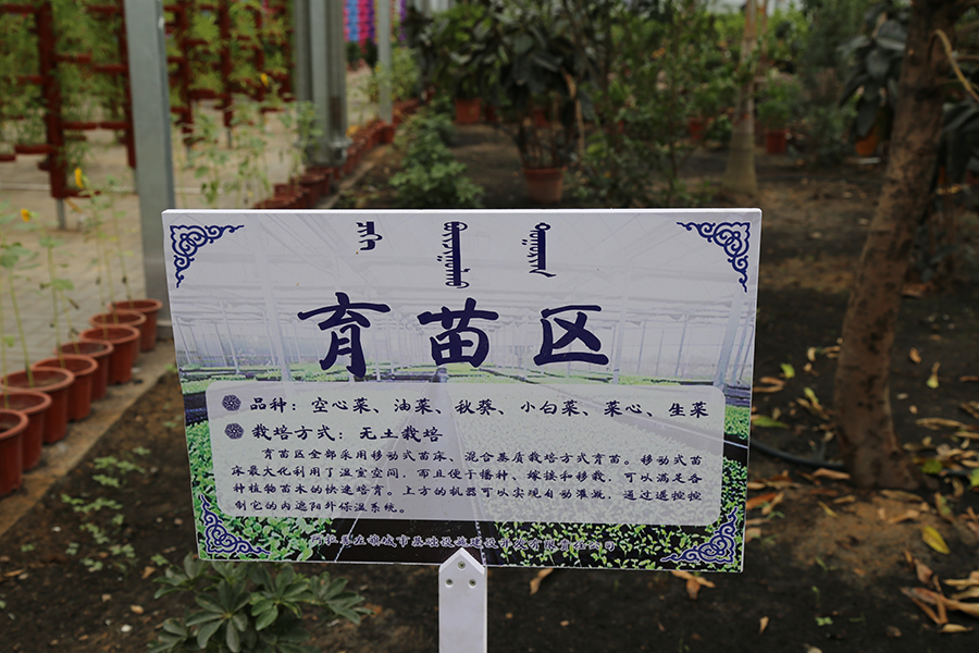 智能溫室大棚占地約6000平方米,分為一號廳和二號廳。其中一號廳是新建的有錯層的玻璃溫室,分為盆栽花卉、盆栽果樹區(qū)、沙生植物區(qū)、熱帶風(fēng)情區(qū)、家庭園藝區(qū)等功能區(qū)。二號廳由舊溫室改造而成,頂部為陽光板,四周立面為玻璃,配置了智能控制系統(tǒng),有無土栽培區(qū)、育苗區(qū)、采栽體驗區(qū)等功能區(qū)。智能溫室全部配備了內(nèi)、外保溫系統(tǒng),冬季保溫,比普通溫室更節(jié)能。溫棚內(nèi)移動苗床一次育苗30萬株,可供給巴彥霍德406座溫棚,一定程度上帶動了農(nóng)民增收。不論是熱帶植物、水果還是沙漠植物,在這里你可以一覽無余,一年四季感受綠色勃勃生機(jī)。