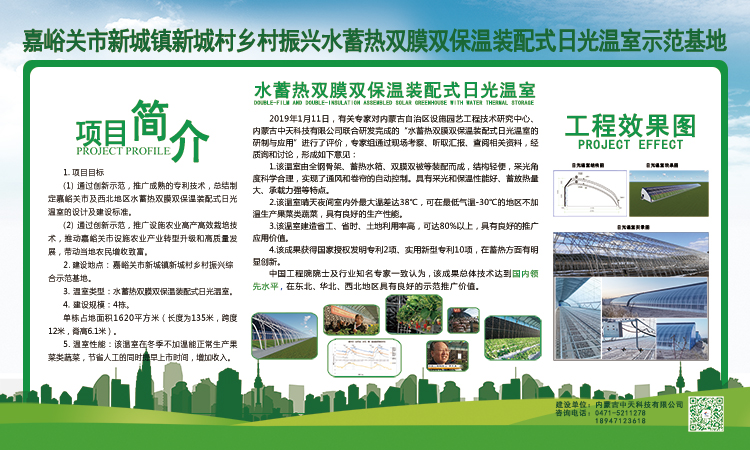 嘉峪關市新城鎮(zhèn)新城村鄉(xiāng)村振興水蓄熱雙膜雙保溫裝配式日光溫室示范基地水蓄熱雙膜雙保溫裝配式日光溫室是由內(nèi)蒙古農(nóng)業(yè)大學與內(nèi)蒙古中天科技有限公司聯(lián)合研發(fā)完成,并已在東北、西北、華北等地區(qū)進行了大面積的示范推廣。該溫室集成了10多項專利技術(shù),實現(xiàn)了北方寒冷地區(qū)冬季不加熱正常生產(chǎn)果菜類蔬菜,對于促進設施蔬菜產(chǎn)業(yè)發(fā)展及帶動當?shù)剞r(nóng)民增收致富有著非常重要的意義,該溫室具備以下特點: